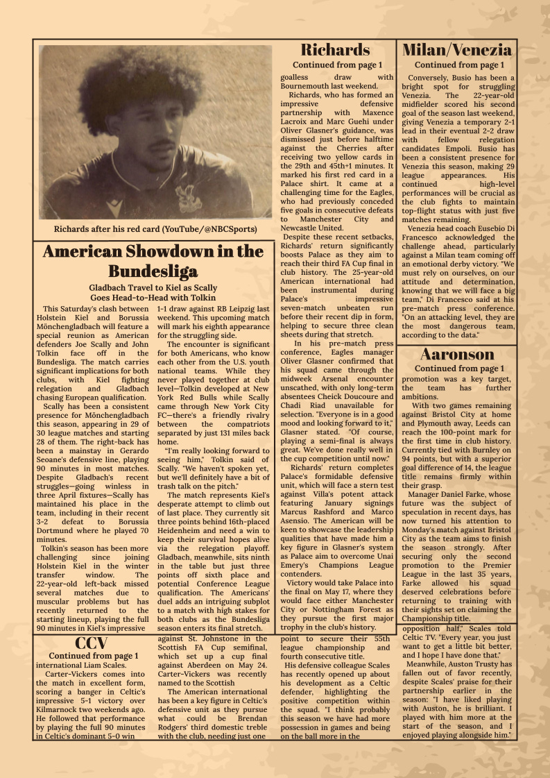 The match represents Kiel's desperate attempt to climb out of last place. They currently sit three points behind 16th-placed Heidenheim and need a win to keep their survival hopes alive via the relegation playoff. Gladbach, meanwhile, sits ninth in the table but just three points off sixth place and potential Conference League qualification. The Americans' duel adds an intriguing subplot to a match with high stakes for both clubs as the Bundesliga season enters its final stretch.