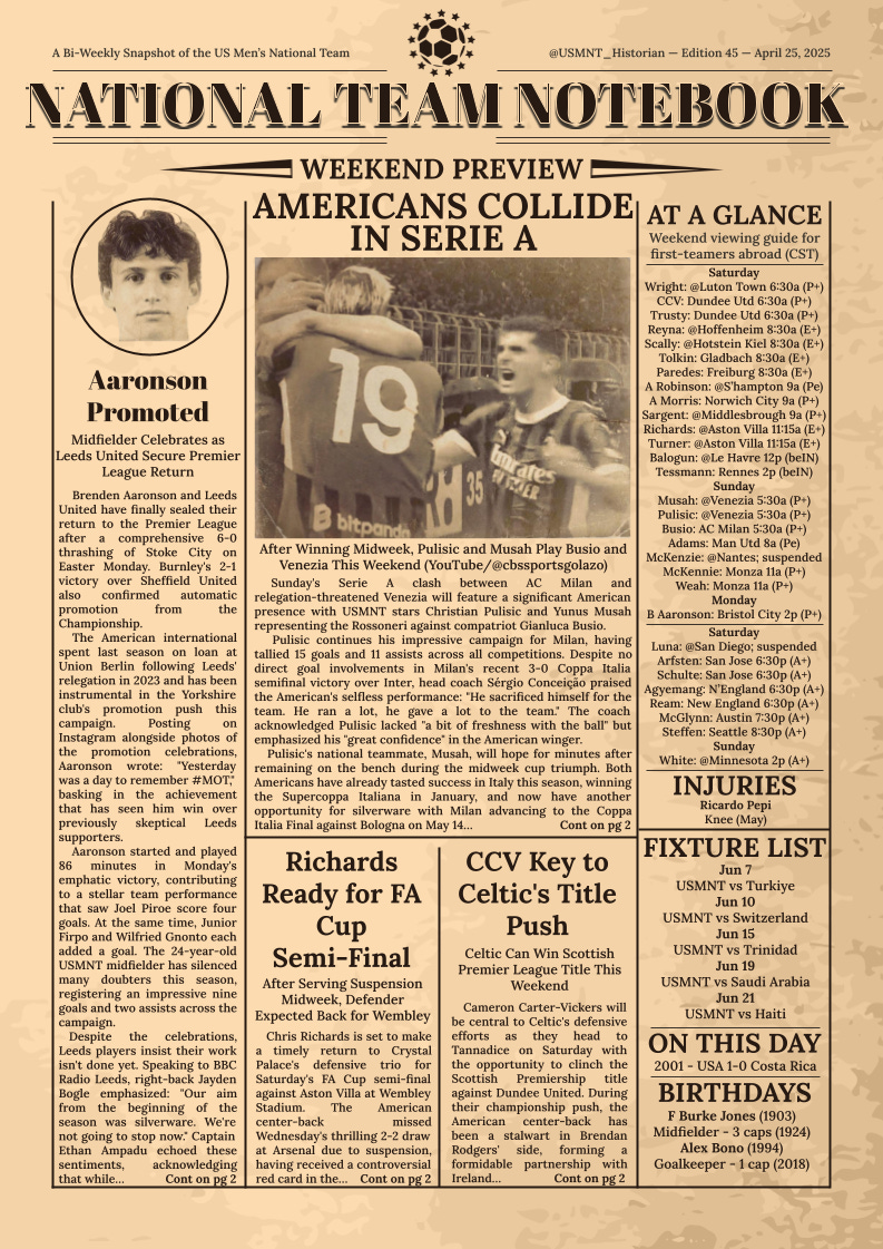 Aaronson started and played 86 minutes in Monday's emphatic victory, contributing to a stellar team performance that saw Joel Piroe score four goals. At the same time, Junior Firpo and Wilfried Gnonto each added a goal. The 24-year-old USMNT midfielder has silenced many doubters this season, registering an impressive nine goals and two assists across the campaign.
